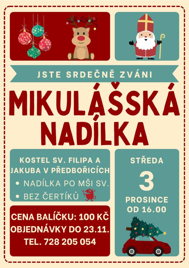 KOSTEL SV. FILIPA A JAKUBA V PŘEDBOŘICÍCH STŘEDA 3. PROSINCE OD 16.00 CENA BALÍČKU: 100 KČ OBJEDNÁVKY DO 23.11. TEL. 728 205 0543NADÍLKA PO MŠI SV.NADÍLKA PO MŠI SV.BEZ ČERTÍKŮBEZ ČERTÍKŮ