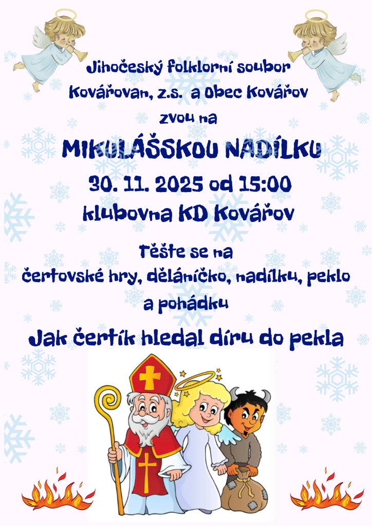 Folklorní soubor Kovářovan ve spolupráci s obcí Kovářov zve všechny děti na Mikulášskou nadílku. V neděli 30. 11. 2025 od 15:00 v klubovně v KD Kovářov