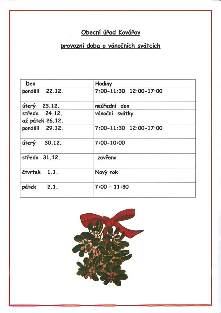 Pracovní doba úřadu je uvedena v přiloženém letáčku. Radostné Vánoce plné klidu a pohody v roce 2026 mnoho zdraví štěstí Vám všem ze srdce přejí zastupitelé, zaměstnanci a starostka obce.
