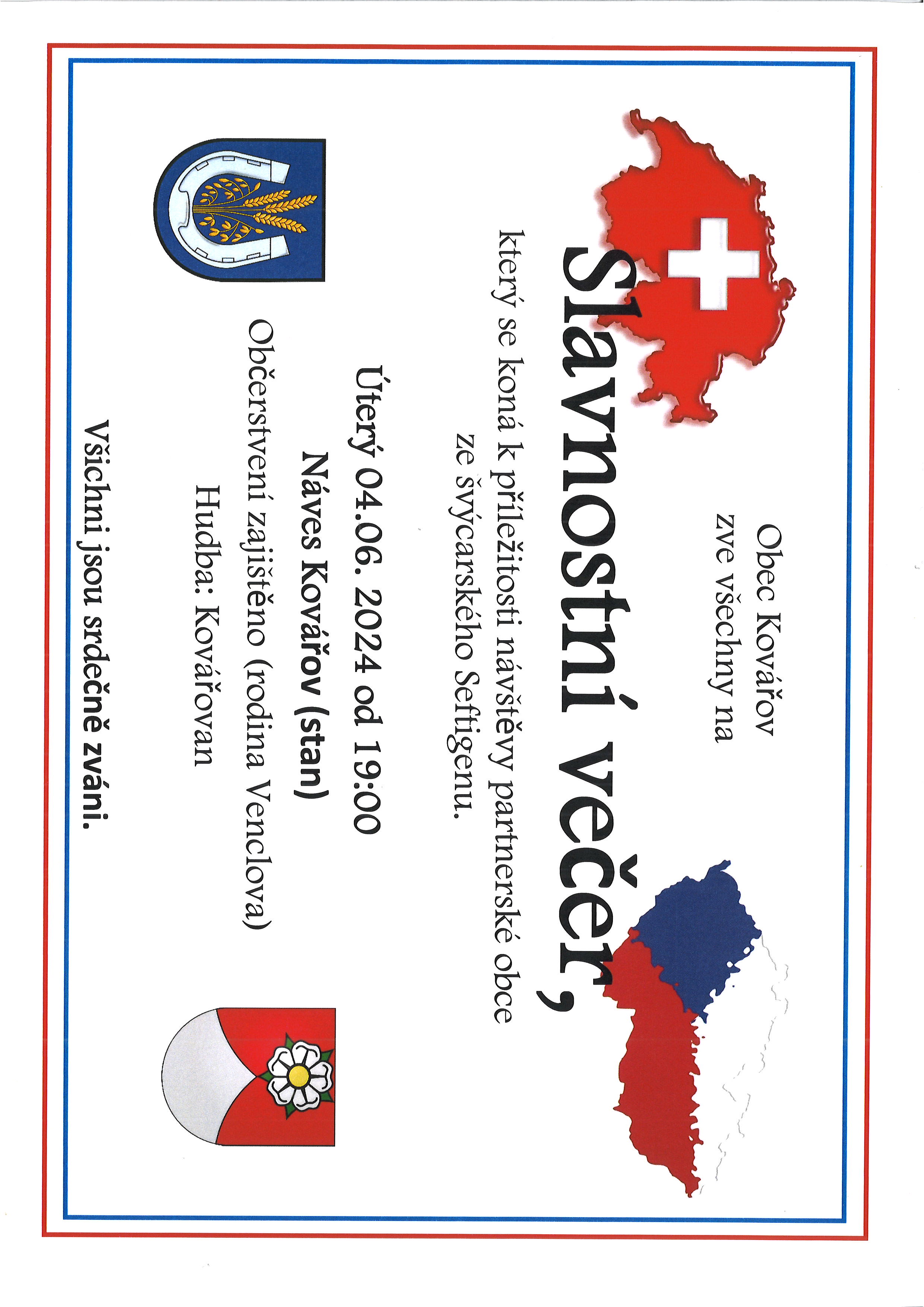 Obec Kovářov zve občany Kovářova na Slavnostní večer, který se bude konat v úterý 4.6. od 19 hod. v Kovářově na návsi v párty stanu. Hudba: Kovářovan, Občerstvení rodina Venclova.