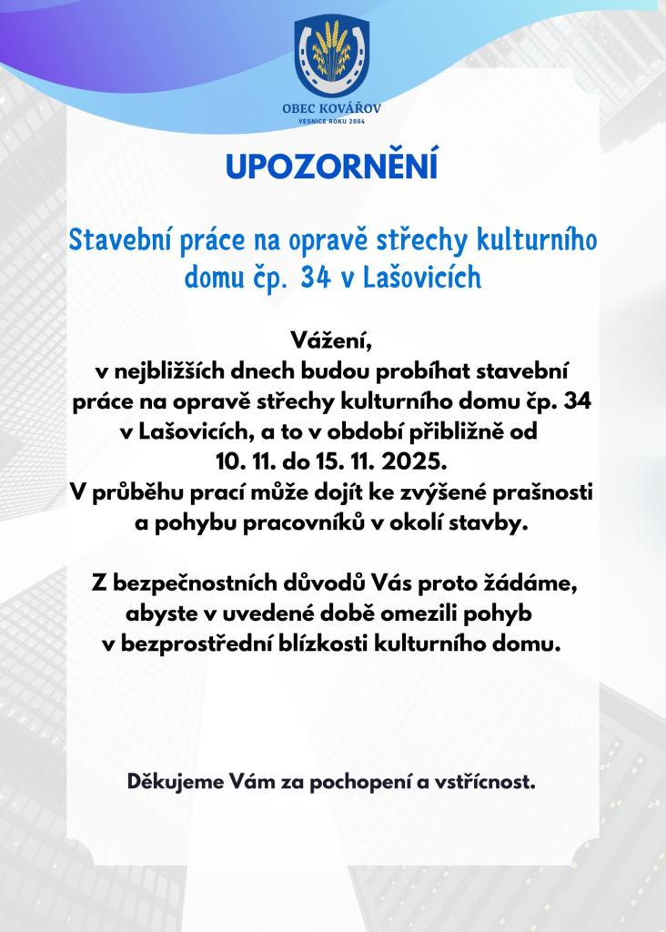 V nejbližších dnech budou probíhat stavební práce na opravě střechy kulturního domu čp. 34 v Lašovicích, a to v období přibližně od 10. 11. do 15. 11. 2025.
