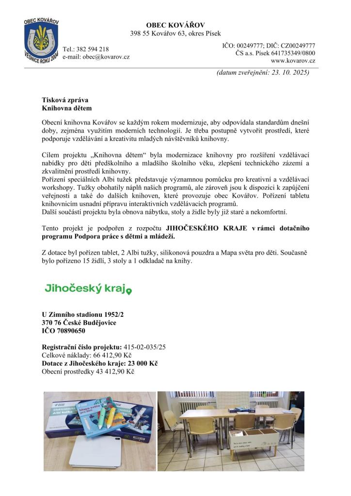 Obec Kovářov získala dotaci na zlepšení technického zázemí a zkvalitnění prostředí knihovny. Projekt Knihovna dětem byl realizován s finanční podporou Jihočeského kraje v rámci dotačního programu Podpora práce s dětmi a mládeží