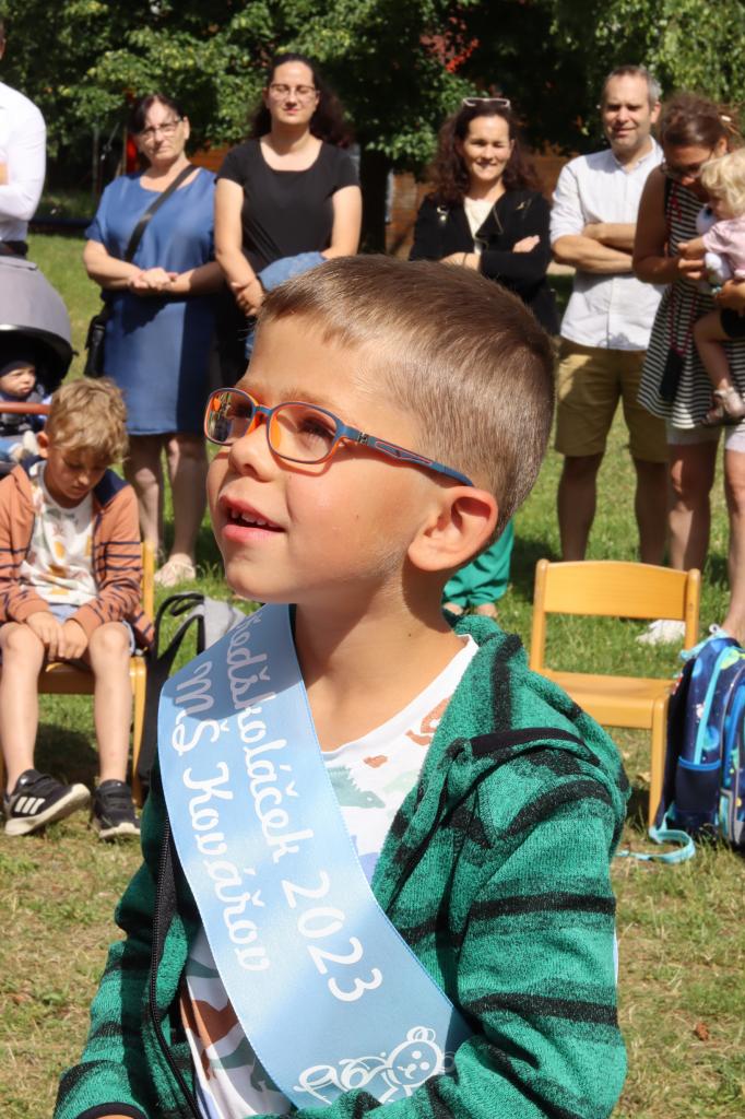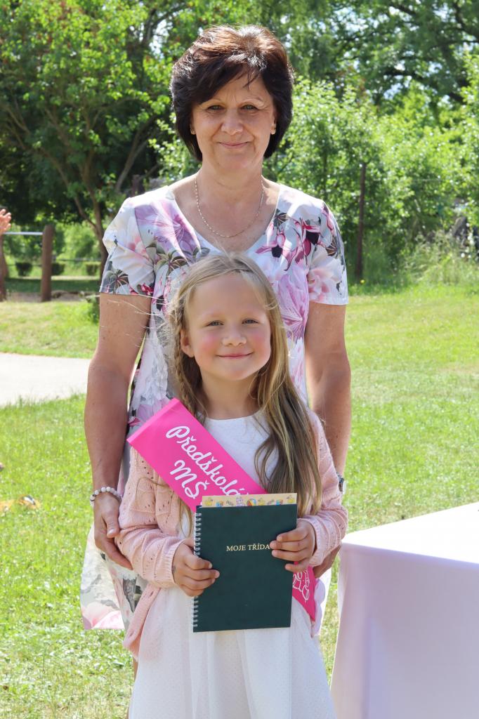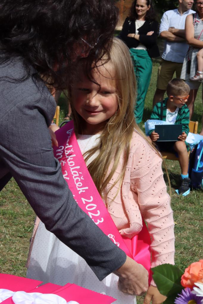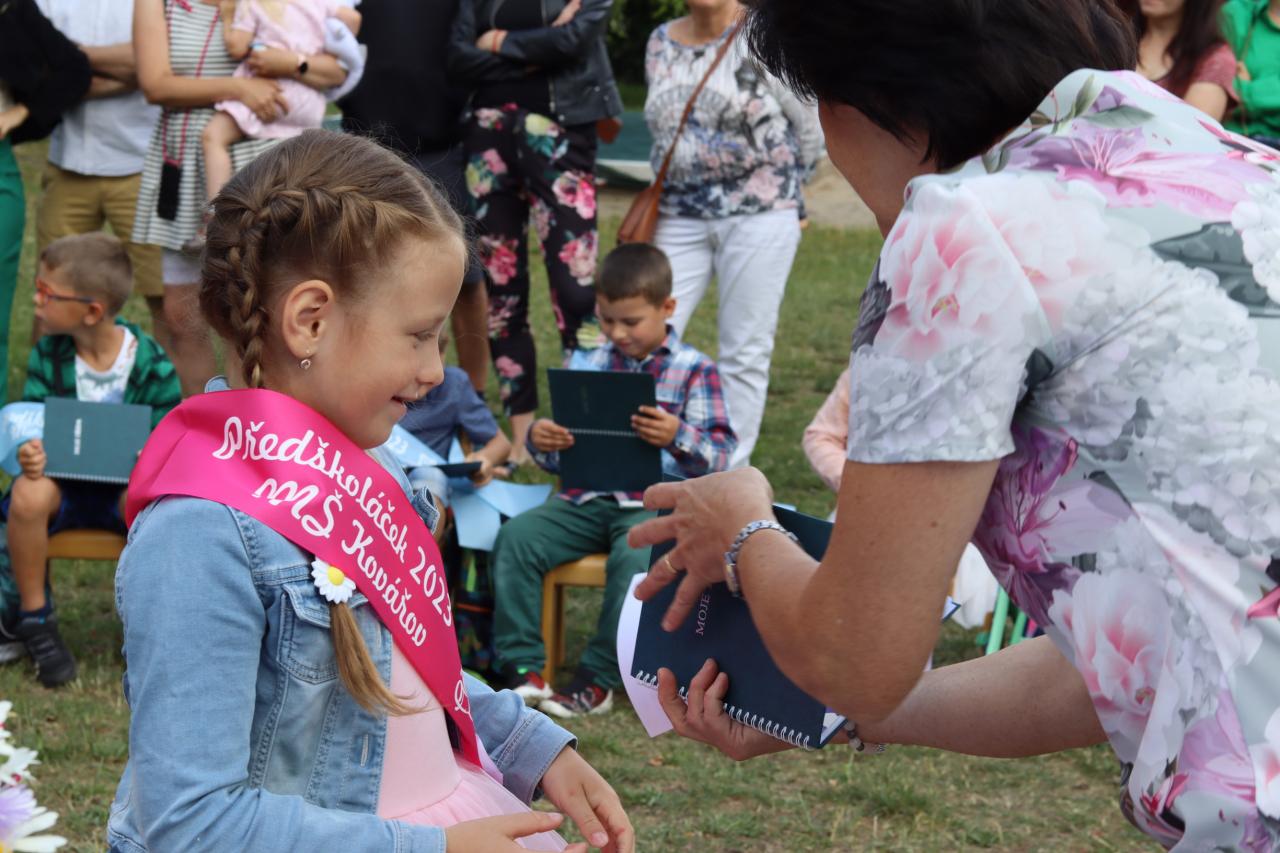Ve středu 28.6.2023 se v areálu MŠ Kovářov konalo slavnostní rozloučení se školkou. Děti obdržely od starostky obce šerpu a fotoknihu, od paní ředitelky pamětní list a na závěr akce se na památku vyfotografovaly. Foto: Petra Baštýřová
