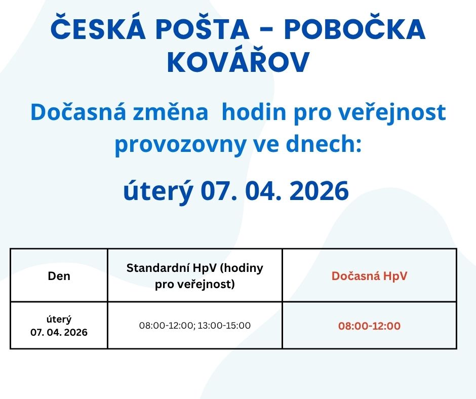 Česká pošta - pobočka Kovářov upozorňuje na dočasnou změnu hodin pro veřejnost provozovny, v úterý 07. 04. 2026 -otevřeno pouze do 12:00 hod.