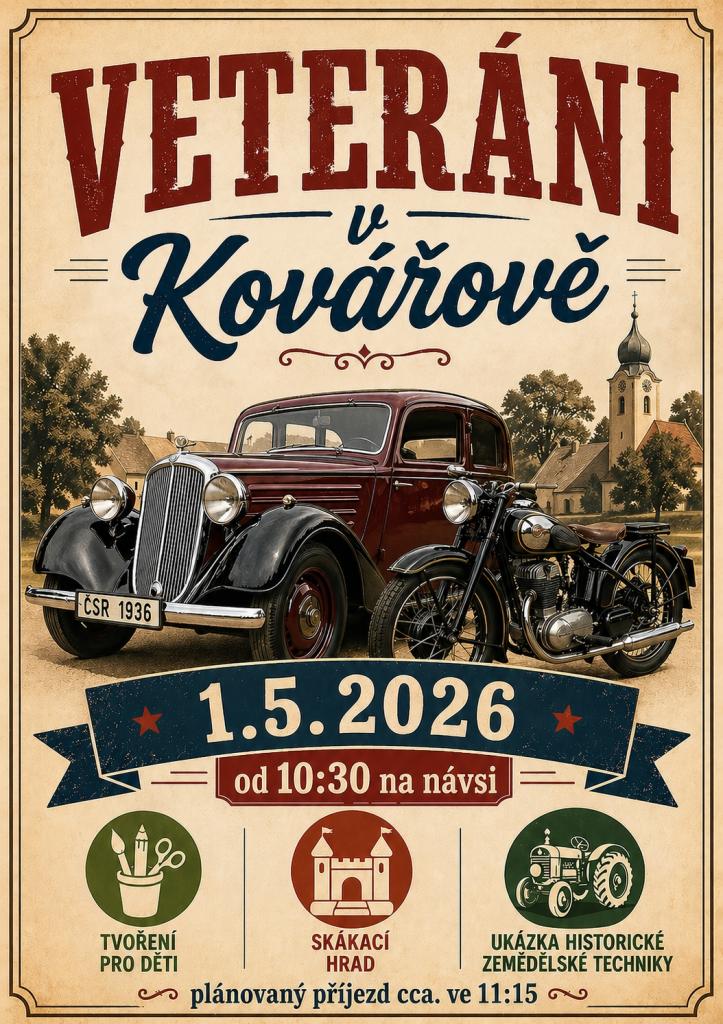 Zveme vás na prohlídku historické techniky do krásného prostředí kovářovské návsi. Aktivity pro děti i občerstvení zajištěno.